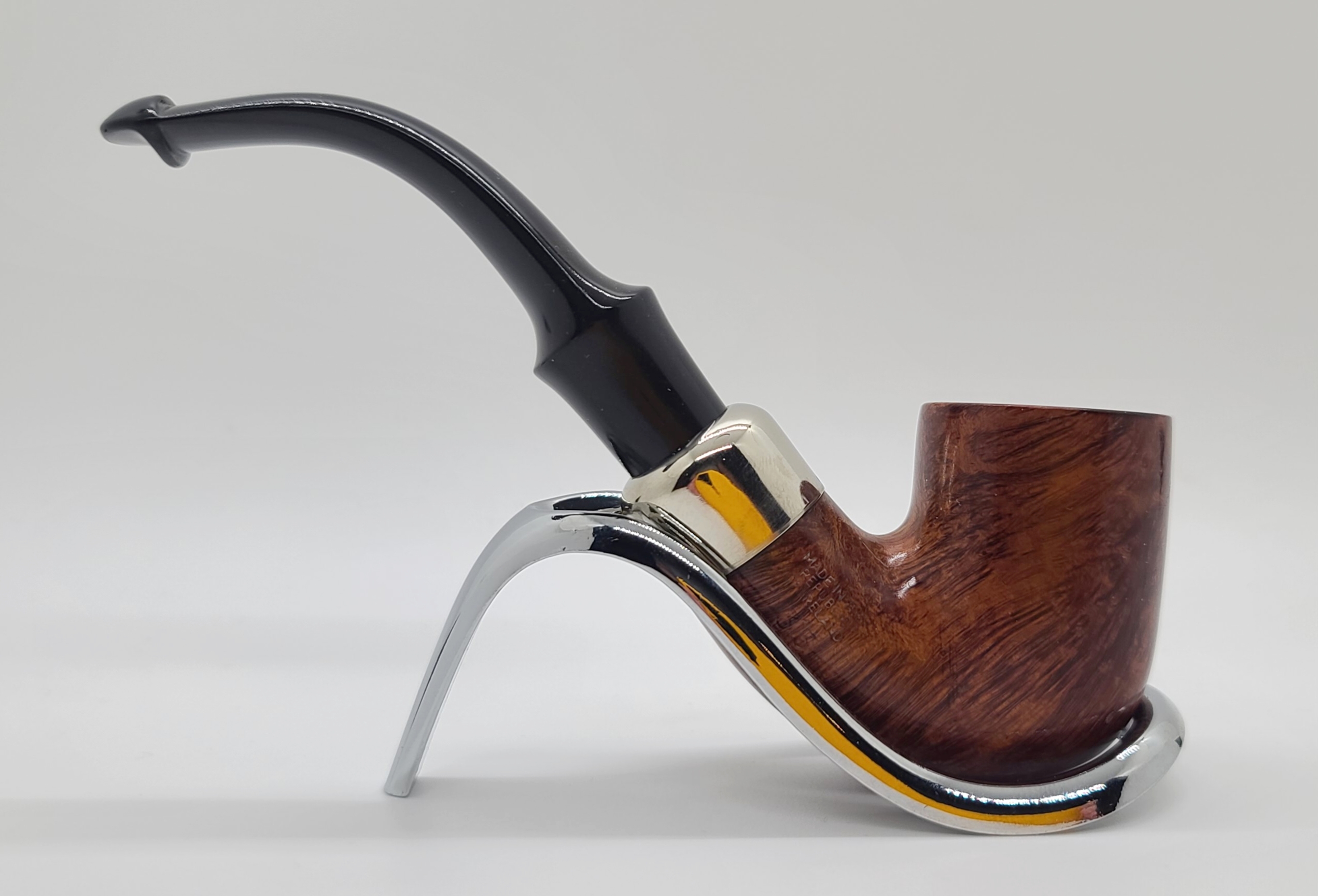 Though quite compact in terms of overall length, this bent Billiard shape maintains the signature muscularity and tubular profile that define their House Style, the bowl being more cylindrical in shape with a stout, angular transition. Its half bend provides a natural clenching posture for a comfortable, . hands-free smoke.
